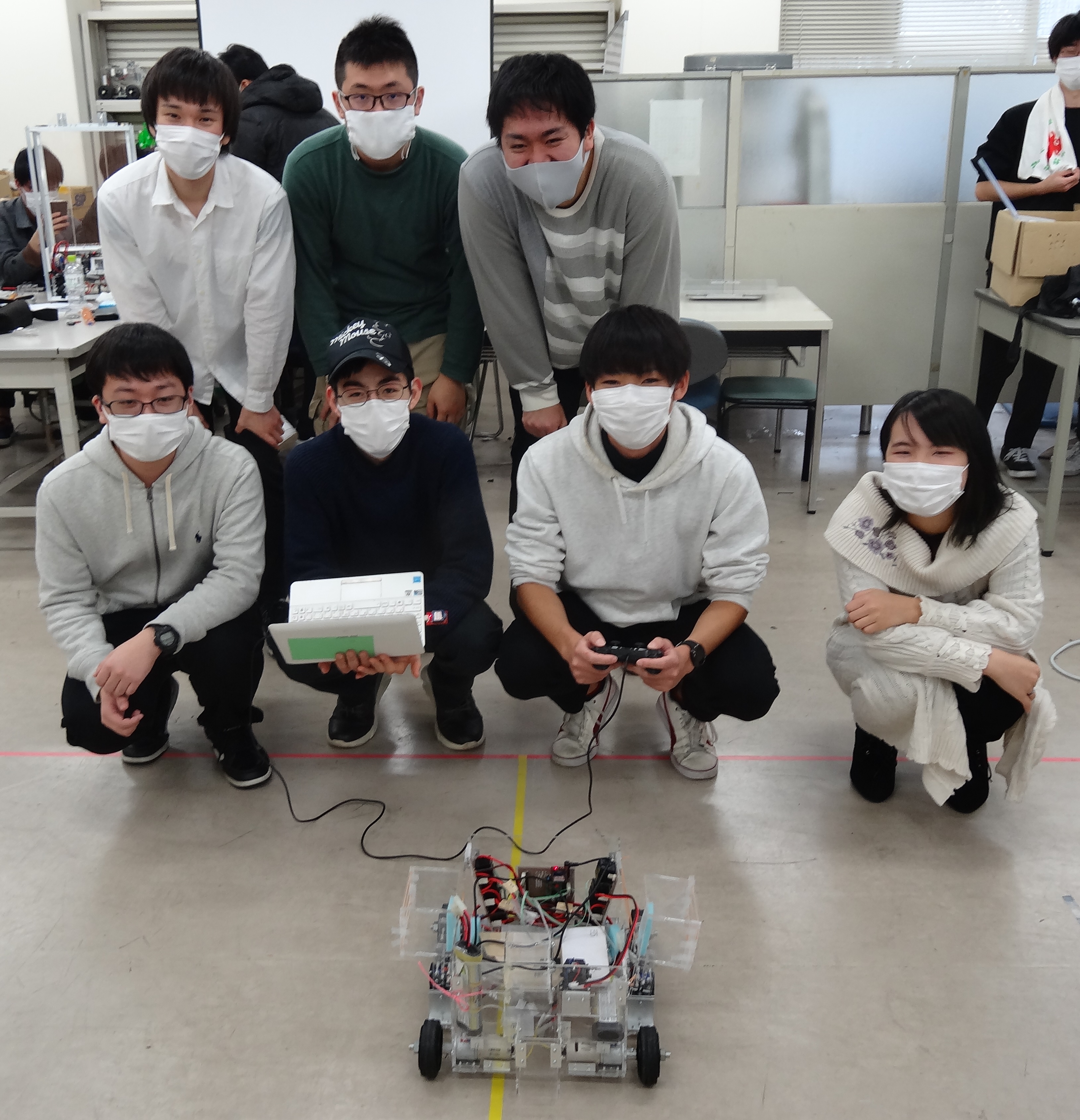 ロボットコンテストは2021年2月15日にC8号館1階メカトロニクス実験室で開催され、4チーム4台のロボットが参加しました。感染症対策として、チーム毎の記念写真を撮影しました。