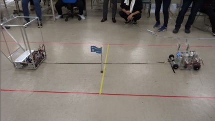2つのロボットが対戦し、中央の旗が倒れれば終了です。時間内に決着がつかない場合は、紐の中央の位置で判断します。4チームの総当たりで綱引きをし、総当たりの勝敗で順位をつけます。Aブロック